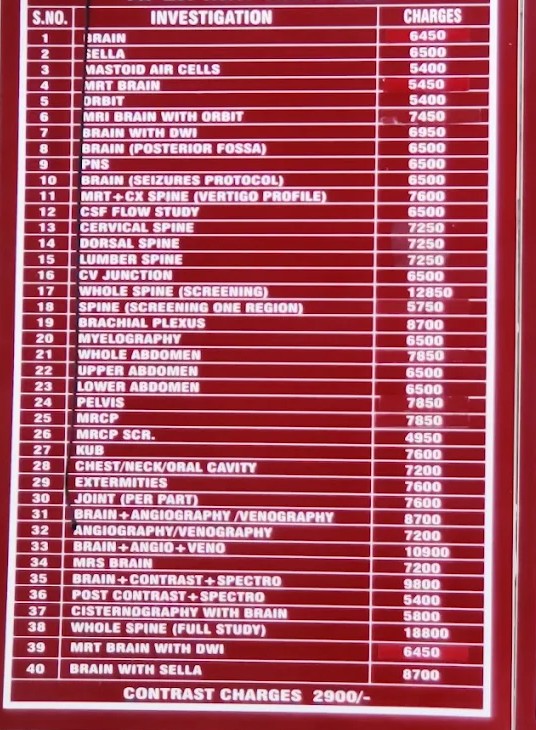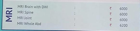 - Brain MRI (with/without contrast): Starts approx. ₹2,750 – ₹5,000+